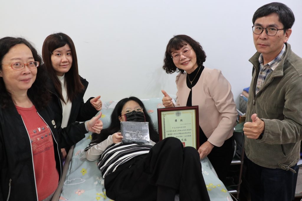 「終於看到妳了,妳真的好棒!」高雄市立空中大學校長陳月端今(11)日親自前往因重度身障長年臥床、甫獲「富仁教育永續基金會獎助學金」的外文系學生藍翊慈家中,為她頒發獎狀,並俯身給翊慈一個溫暖的擁抱。翊慈的媽媽感謝高雄空大為她打開學習之窗,以遠距教學造福更多像女兒這樣的肌肉萎縮症患者。