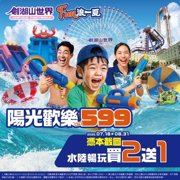 - 活動截圖買二送一:陽光歡樂599,憑活動截圖,即可享有水陸暢玩門票「買2送1」的超值優惠。