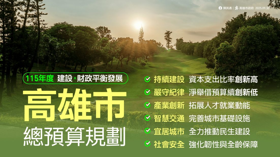 市府強調,115年度總預算符合財政紀律規範,在穩健財政基礎上持續推動重大建設,強化高雄永續、韌性與轉型發展。