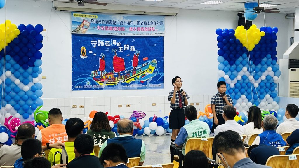 高雄市立圖書館永安分館於10月1日上午11時,在永安國小西棟三樓禮堂舉辦《守護藍海的王船爺》繪本發表會,現場貴賓雲集,包括地方民意代表、區公所、里長、合作單位及學校師生,共同見證這本融合在地文化與海洋保育理念的作品誕生。