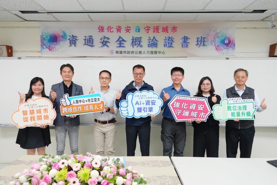 高雄空大與高雄市政府公務人力發展中心合作開辦「資通安全概論」專班共有兩梯次,首梯次於今(4)日正式開班。高雄市政府副秘書長王宏榮、研考會主任秘書郭榮哲、人事處專門委員許詩蘩、政風處副處長王俊凱、資訊處處長劉俊傑及人發中心張雅閔主任等親臨開訓典禮,充分展現市府團隊對資安教育的高度重視。