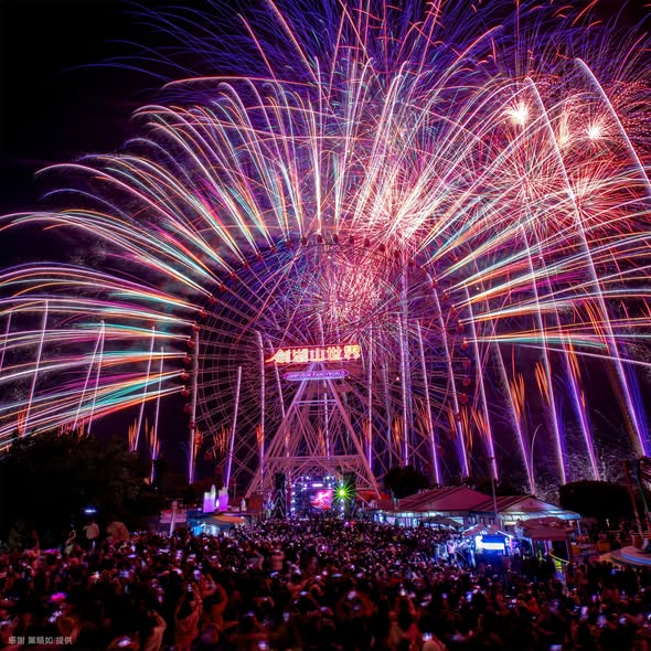 劍湖山世界總經理曾慶欑指出,今年是園區第19年舉辦跨年活動,煙火展演將以摩天輪為主體施放,搭配「舞動無限雙輪煙火」與長達1000公尺的「舞擺環山煙火」、炫彩摩天輪雷射燈光秀,打造10分10秒、象徵十全十美的跨年視覺震撼。精密設計的煙火角度讓現場民眾能享受360度包覆的震撼體驗,從2025一路High到2026。